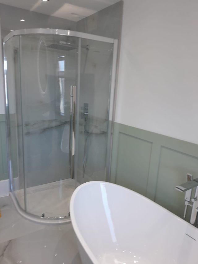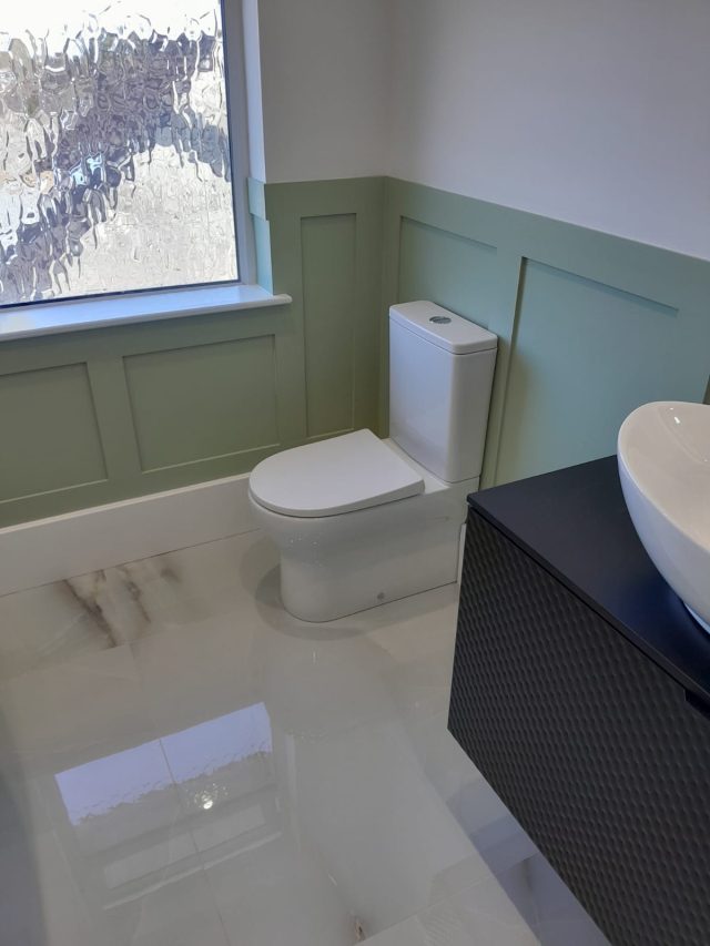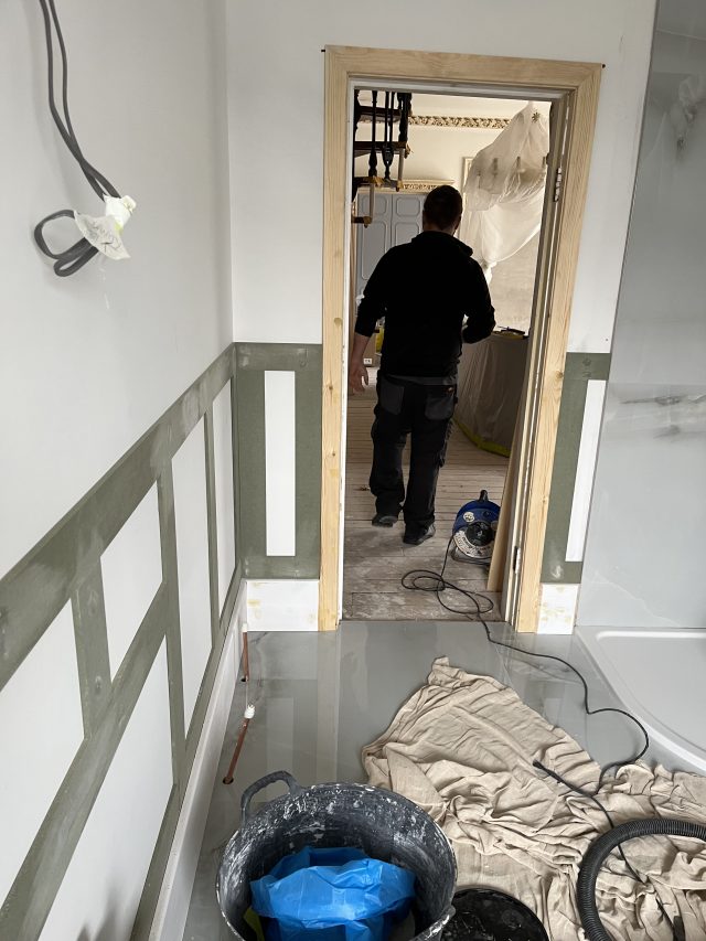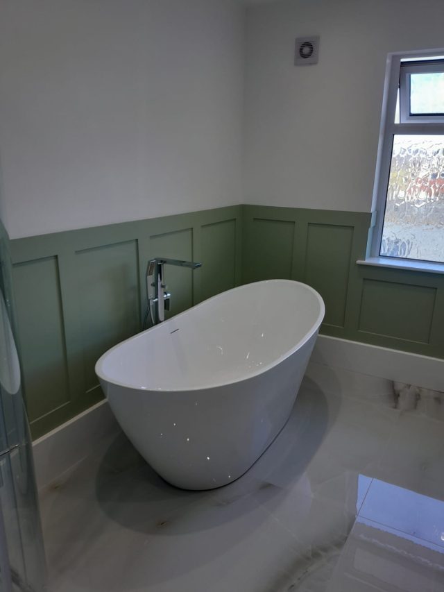Once the moisture resistant MDF was fixed to the walls, and new 9″ skirtings manufactured and fixed, Ade & Steve were dependent on the painters coming in to paint the panelling and skirts, before final fix of furniture could be completed.