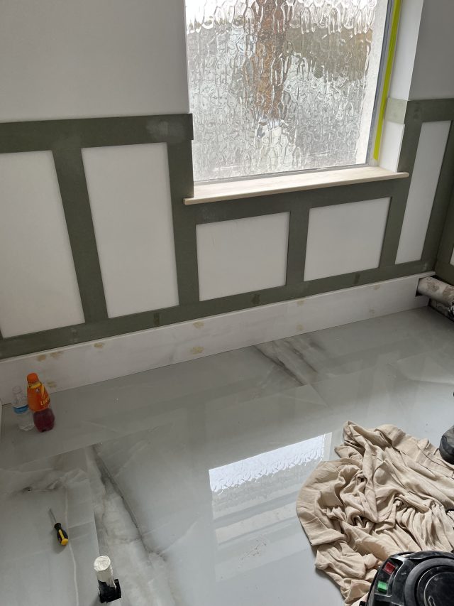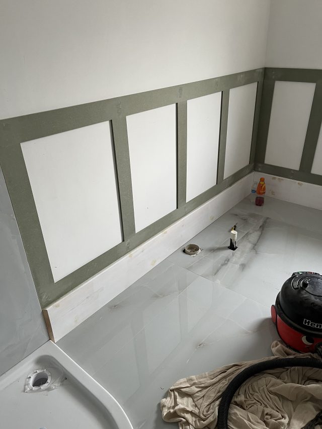 It was at this point that G had a change of mind and decided to tile just the floor and the shower cubicle. Another special request was for the majority of the walls to have traditional ‘shaker’ style panelling strips to the rest of the walls to 1200 high. At least Josh could promptly tile the shower cubicle area and floor.